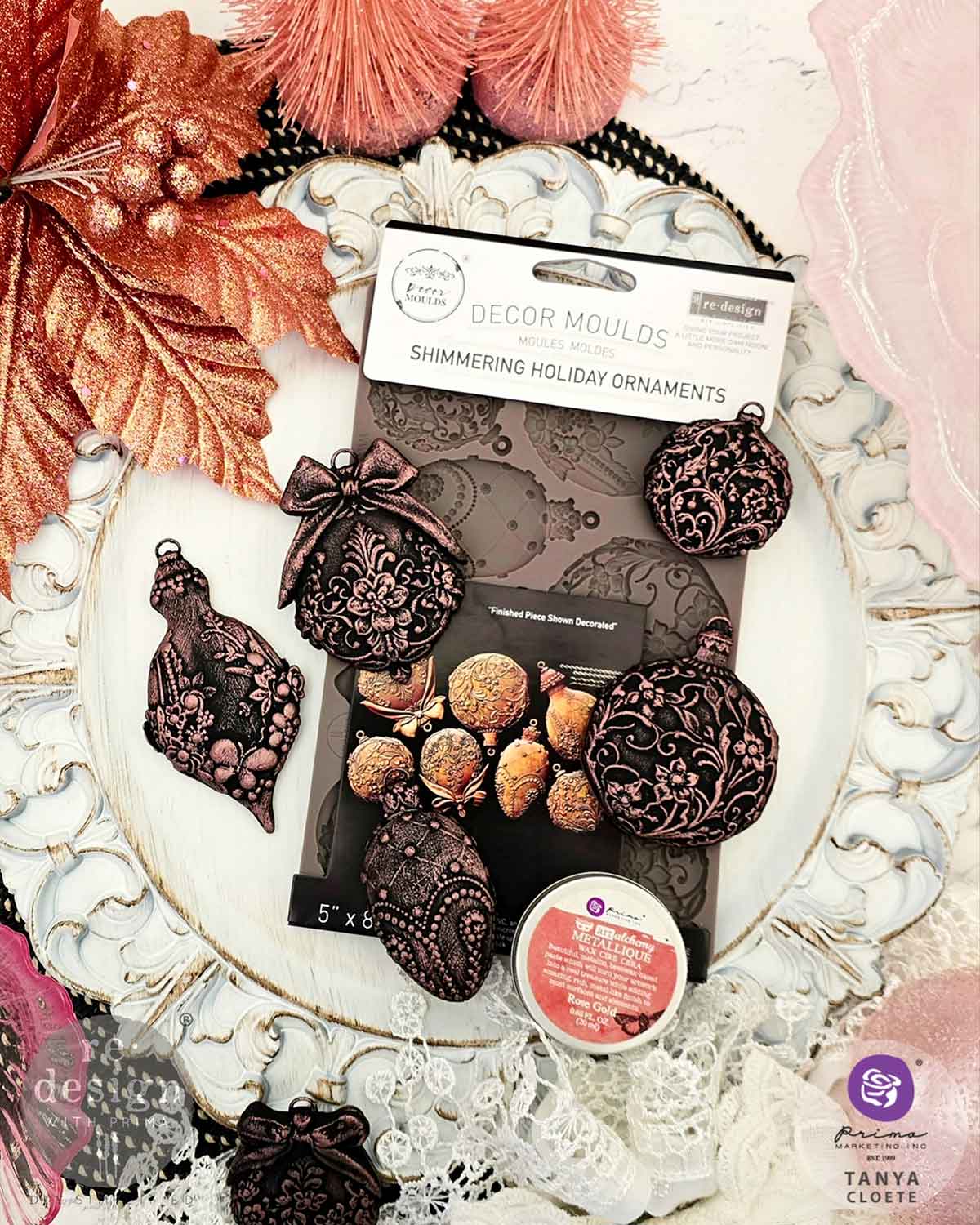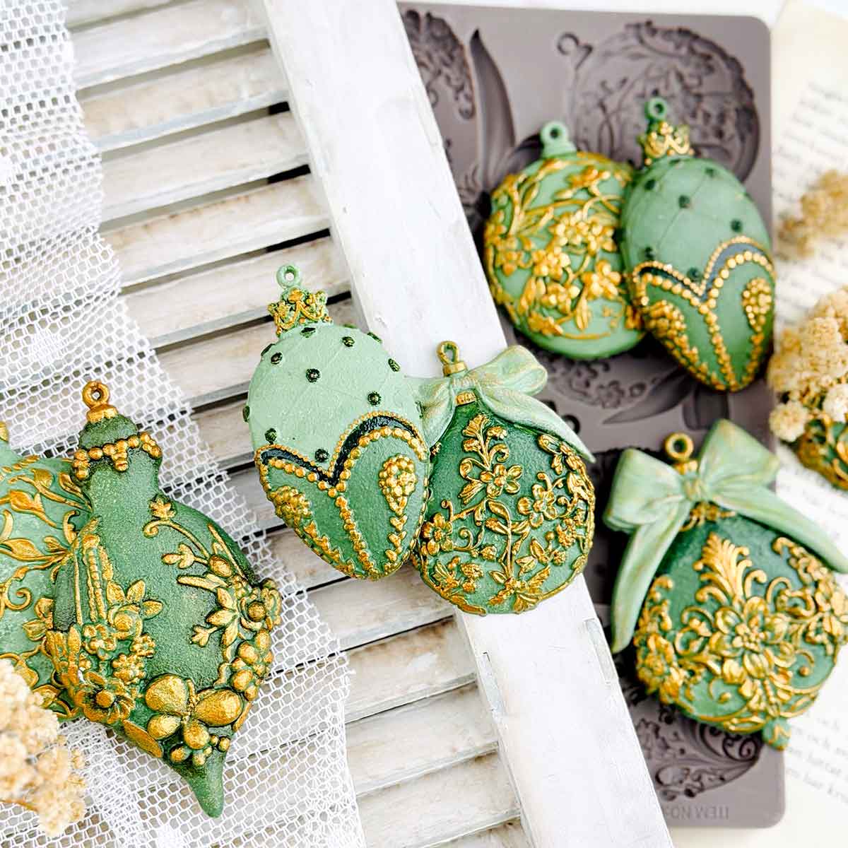 Elegant, detailed, and ready to shine—Shimmering Holiday Ornaments Décor Mould® includes a beautiful selection of embossed baubles featuring floral motifs, bows, pearls, and baroque-inspired textures.