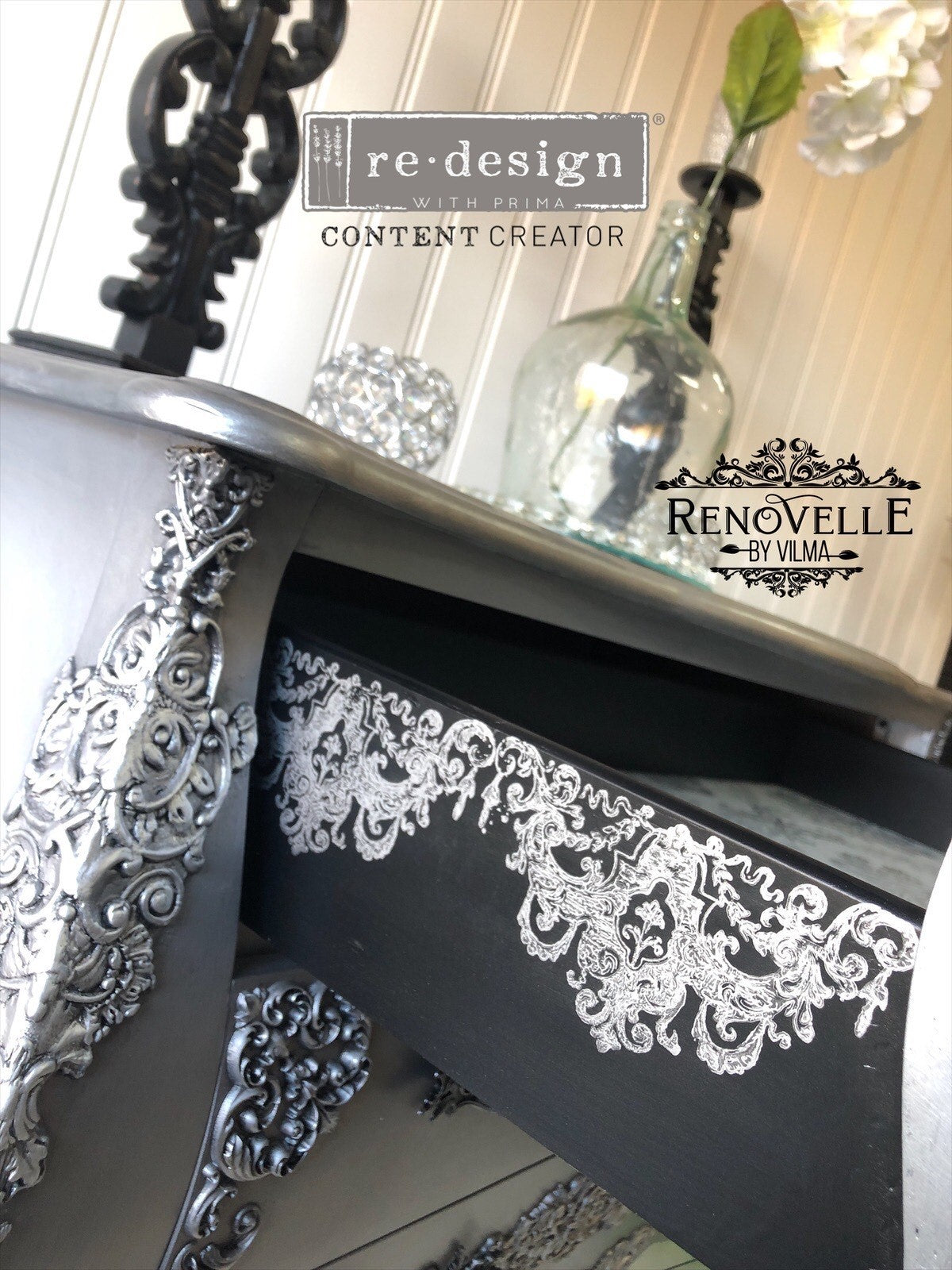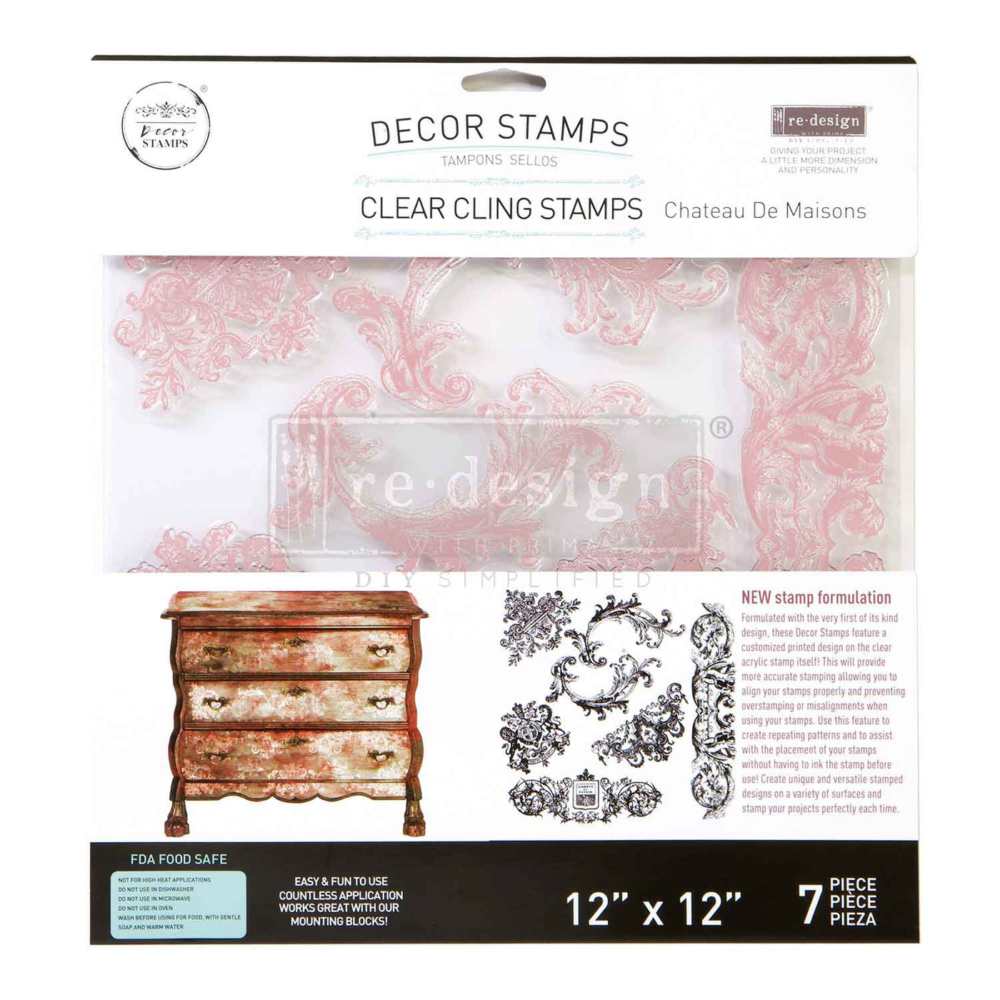 Bring elegant French Baroque style to your projects with the Château de Maisons Decor Stamp by Redesign with Prima. Featuring ornate scrolls and classic architectural flourishes, this reusable silicone stamp is perfect for furniture makeovers, mixed-media art, journals, clay, canvas, and DIY décor.