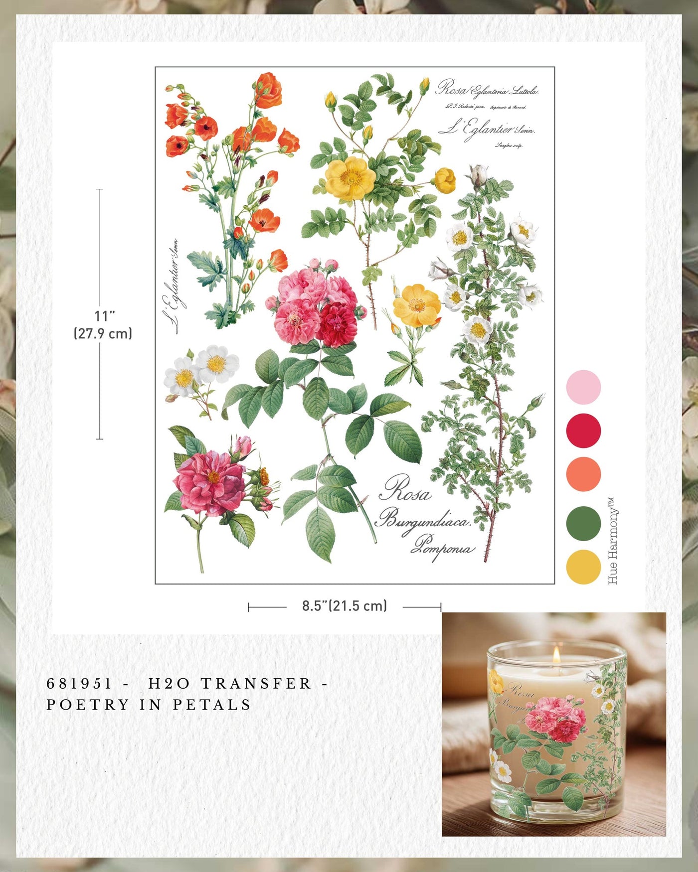 Poetry In Petals brings the romance of classic botanical illustration to life with a beautifully curated collection of roses, wild blossoms, and delicate stems rendered in rich, vintage hues. Designed as water-slide transfers, these H2O decals glide effortlessly into place with a gentle misting—perfect for smooth surfaces like glass, ceramics, candles, metal, glossy furniture, ornaments, and more. Each bloom is printed with exquisite detail, offering an artful way to elevate home décor pieces with soft color, graceful lines, and old-world floral charm. Whether used as standalone accents or layered for a lush botanical display, this sheet adds timeless elegance to every project.